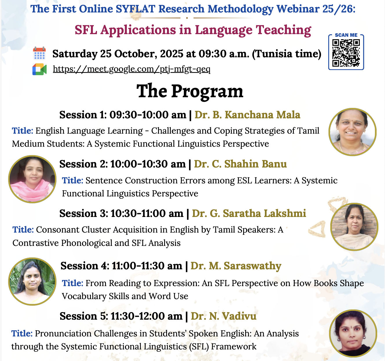 SYFLAT is an academic association interested in the field of Systemic Functional Linguistics (SFL), a school of linguistics founded by the British linguist M. A. K. Halliday in 1961, and then developed and applied to many other fields. SYFLAT was founded on June 12th, 2014 (Reference: 2014S01520APSF1- JORT numero 70), following a series of monthly seminars on SFL held with the Research Laboratory Approaches to Discourse (LAD) at the Faculty of Letters and Human Sciences of Sfax, Tunisia.