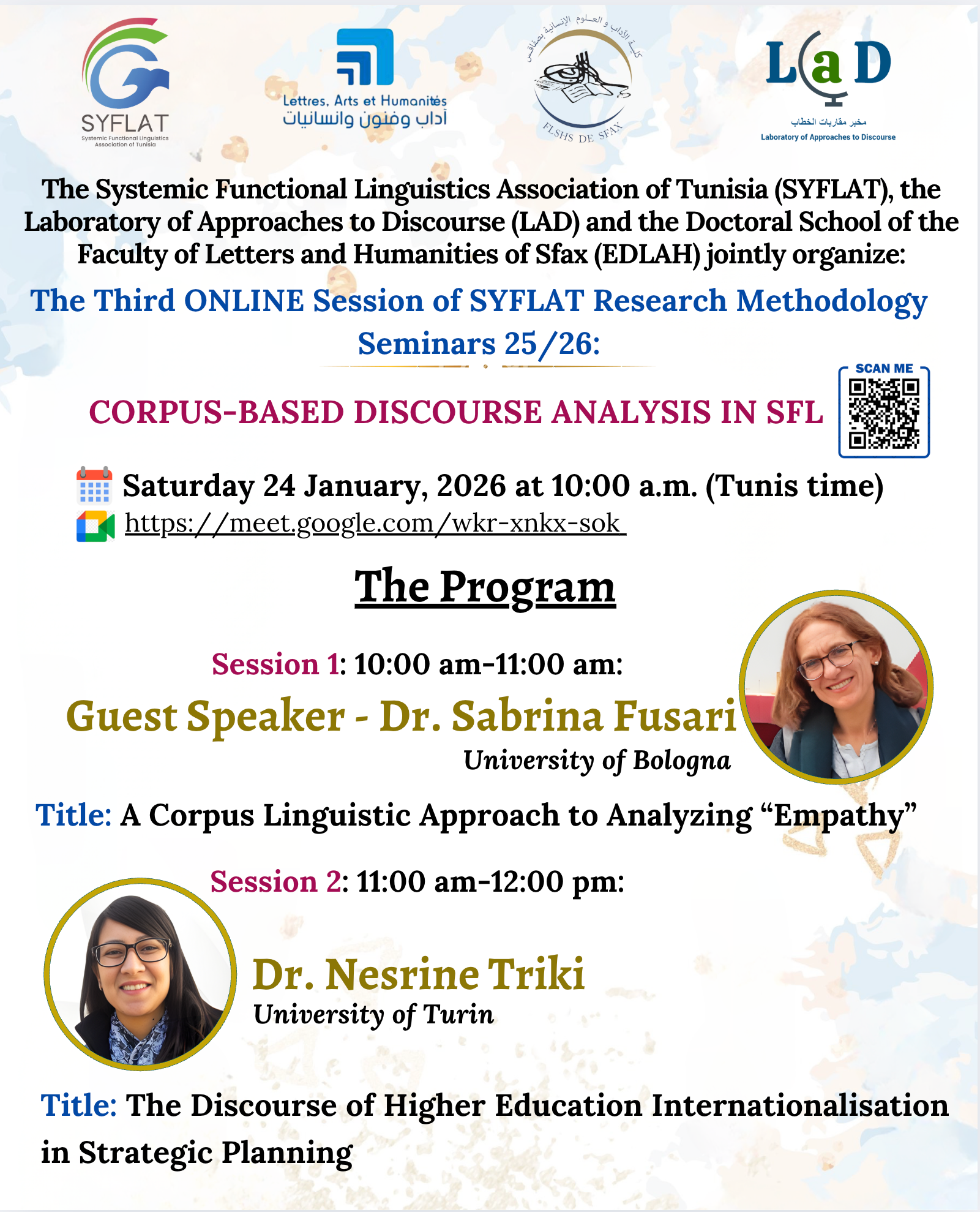 SYFLAT is an academic association interested in the field of Systemic Functional Linguistics (SFL), a school of linguistics founded by the British linguist M. A. K. Halliday in 1961, and then developed and applied to many other fields. SYFLAT was founded on June 12th, 2014 (Reference: 2014S01520APSF1- JORT numero 70), following a series of monthly seminars on SFL held with the Research Laboratory Approaches to Discourse (LAD) at the Faculty of Letters and Human Sciences of Sfax, Tunisia.